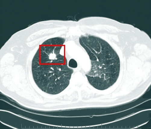 T2는 폐암의 크기가 3cm 이상 7cm 미만을 뜻합니다. 또한 폐암이 장측 흉막을 침범하게 될 경우에도 T2로 분류됩니다. 만약 3cm 이상의 T2 폐암이라도 다른 부위로 침범을 하지 않았으면, T1 폐암과 생존률이 비슷합니다.