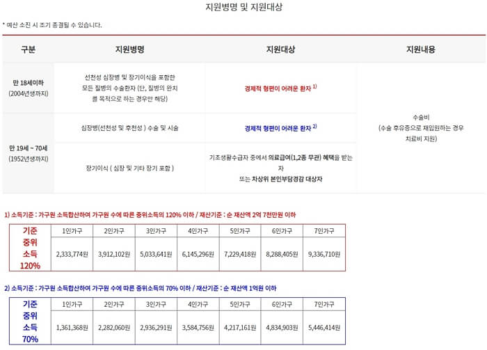 지원 대상은 경제적 형편이 어려운 환자입니다. 자세한 지원병명과 지원대상, 지원내용은 위에 사진 또는 직접 홈페이지에 들어가서 확인을 하시면 됩니다. 재산 및 소득기준에 해당할 경우에만 접수가 가능하며, 지원 여부는 심사를 통해서 정해집니다.
