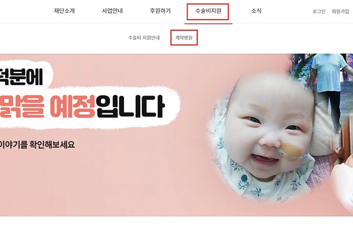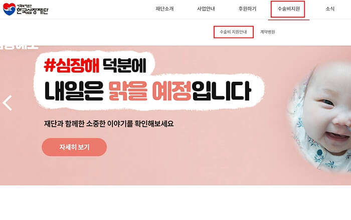 우선 상단에 <수술비지원> 카테고리에 있는 <수술비지원안내>를 눌러주시면 됩니다. 그러면 지원방법 및 지원대상에 대한 내용이 보이실 겁니다.