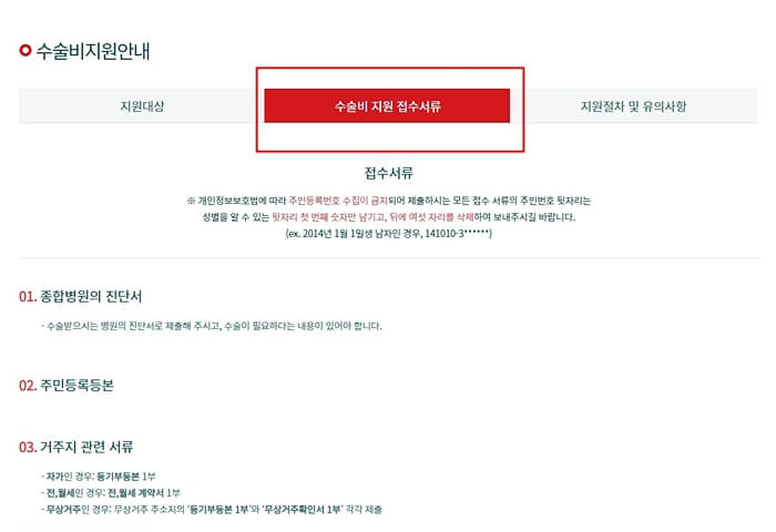 그리고 방금 화면에서 지원대상 옆을 보시면 이식 수술비 지원 접수서류를 확인할 수 있습니다. 참고로 개인정보보호법에 따라 주민등록번호 수집이 금지되어 있기 때문에 제출해야 하는 모든 접수 서류의 주민번호 뒷자리는 성별을 확인할 수 있는 뒷자리 첫 번째 숫자만 남기고 뒤에 여섯 자리는 반드시 삭제해서 제출하셔야 합니다.